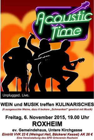 Wein und Kulinarisches treffen Musik - unter diesem Motto veranstaltet der Ortsverein Roxheim am 06.11. ein Sinnesevent. 6 ausgesuchte Weine vom Weingut Alfred Heil, dazu von Vor- bis Nachspeise jeweils eine Köstlichkeit, kombiniert mit unplugged Musik von Acoustic Time. Dies verspricht ein wirklich schöner Abend zu werden. Und aus der Vergangenheit: alle TeilnehmerInnen waren begeistert ! Leider stehen für diese Veranstaltung nur max 70 Karten zur Verfügung. Deshalb gilt : Schnell den Vorverkauf beim Weingut Heil oder der Bäckerei Kessel in Roxheim nutzen .....