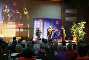 Multimedia in der Roxheimer Birkenberghalle - hier überreicht Ortsvereinsvorsitzender Michael Schaller Gernot Hassknecht alias Hans-Joachim Heist aus der ZDF heute show ein Präsent.