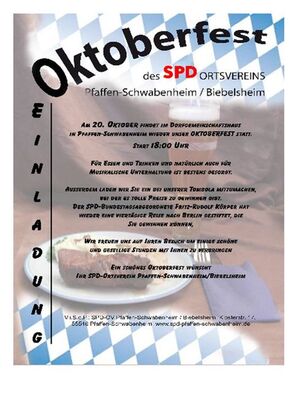 Am 20. Oktober 2012 findet im Dorfgemeinschaftshaus in Pfaffen-Schwabenheim das Oktoberfest des SPD-Ortsvereins Pfaffen-Schwabenheim/Biebelsheim statt.